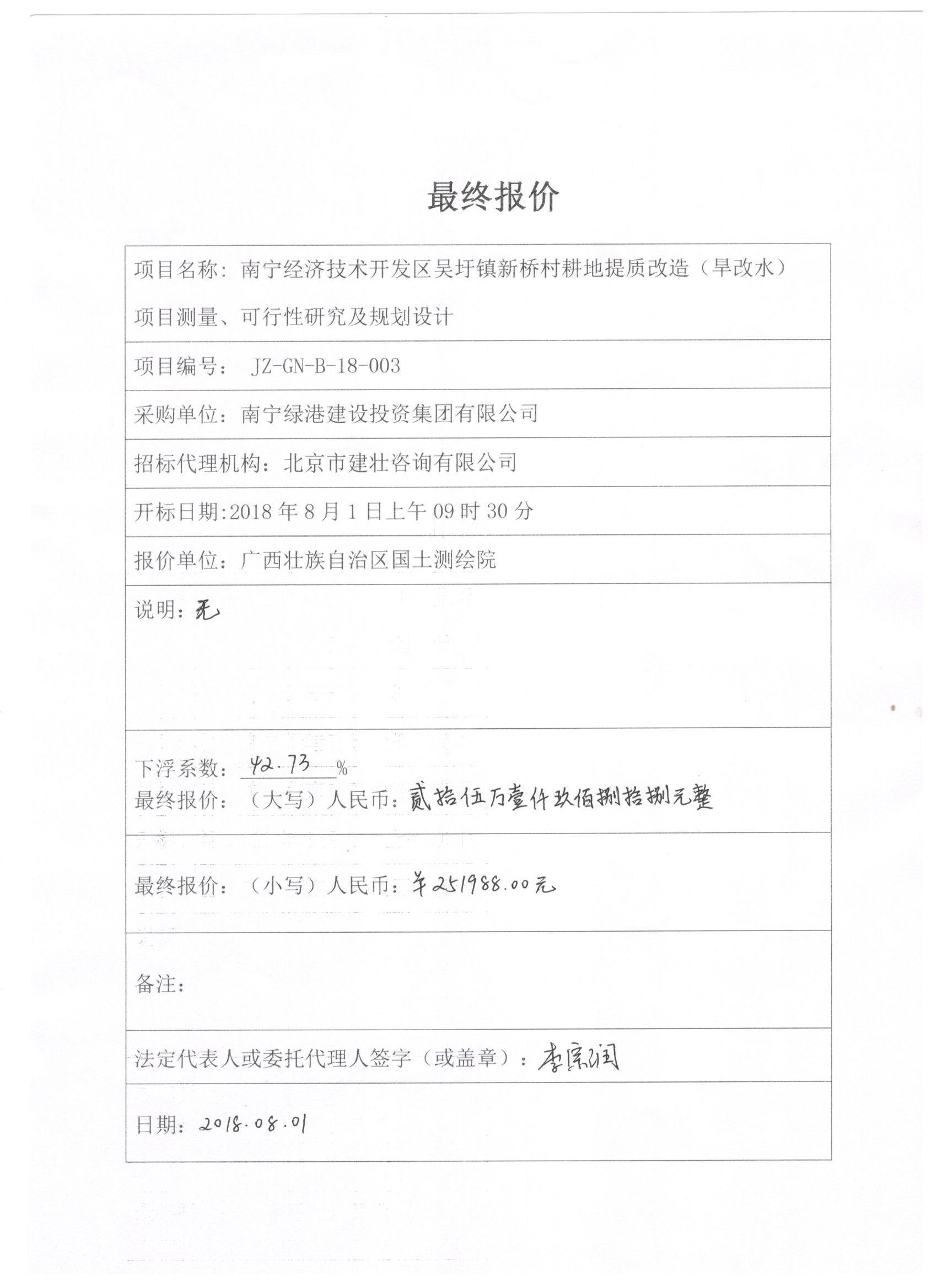 南宁经济技术开发区吴圩镇新桥村耕地提质改造(旱改水)项目测量、可行性研究及规划设计(项目编号:JZ-GN-B-18-003)成交结果公告